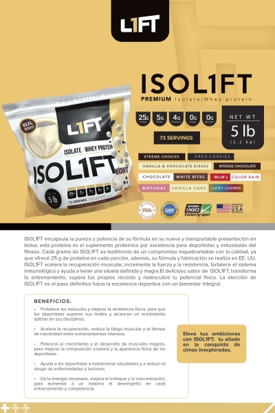 ISOL1FT encapsula la pureza y potencia de su fórmula en su nueva y transportable presentación en bolsa, esta proteína es el suplemento proteínico por excelencia para deportistas y entusiastas del fitness. Cada gramo de ISOL1FT es testimonio de un compromiso inquebrantable con la calidad, ya que ofrecé 25 g de proteína en cada porción, además, su fórmula y fabricación se realiza en EE. UU. ISOL1FT acelera la recuperación muscular, incrementa la fuerza y la resistencia, fortalece el sistema inmunológico y ayuda a tener una silueta definida y magra.El delicioso sabor de ISOL1FT, transforma tu entrenamiento, supera tus propios récords y redescubre tu potencial físico. La elección de ISOL1FT es el paso definitivo hacia la excelencia deportiva con un bienestar integral.